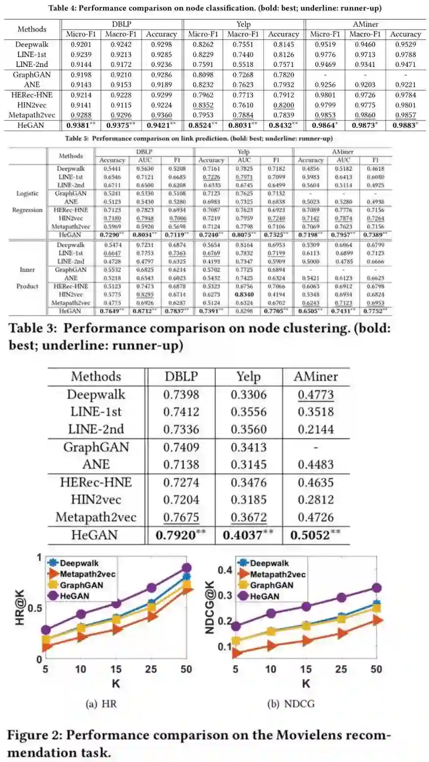 我们在四个公共数据集进行一系列下游任务的实验。结果表明HeGAN具有明显的优越性。