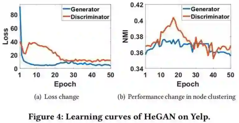 我们给出了Yelp上的HeGAN生成器器和判别器的学习曲线,从损失变化和聚类效果两方面进行分析。在损失的初始波动之后,生成器和判别器开始了他们之间的极小极大的博弈,两者的损失逐渐减少。经过大约20个epoch的对抗性训练,两者的损失趋于收敛,而胜者实现了更好的性能。注意,当训练了更多的epoch时,由于过度拟合,聚类性能下降。
