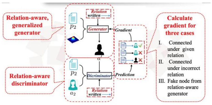 其次,现有的研究在假样本的生成的有效性和效率上有局限性。他们通常对在原始网络中的所有节点上使用某种形式的softmax来生成假样本。在有效性方面,他们的假样本受限于网络中已经存在的节点,或许最具代表性的假样本可能不存在于现有的可观察到的节点。例如,给定一个节点p2,他们只能选择来自空间V(V为网络中所有节点的集合)的样本,比如a1和a3。然而,两者可能都不是与实际节点a2充分相似。为了更好的样本生成, 我们引入一个广义生成器,可以生成例如a’之类的假样本,其中,a’可能并不属于V。我们可以只为a’可能是a1、a3的“平均”,更类似于真正的样本a2。在计算效率方面,softmax函数的计算开销较大,必须采用负采样和图softmax等近似方法。相反,我们的生成器可以直接从连续的空间中采样假节点,而无需使用softmax。我们的具体框架如下所示。