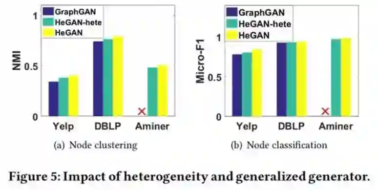 之后,我们在节点聚类和节点分类两个任务上验证异构信息和我们提出的广义的生成器的有效性,我们可以得出如下结论:
