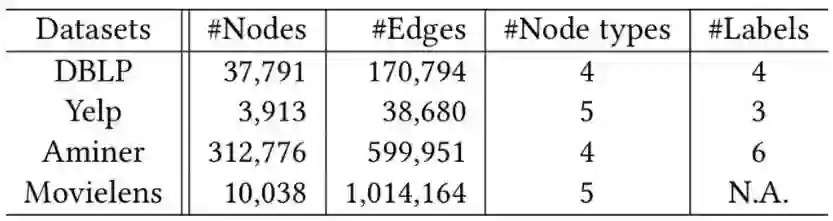 我们在DBLP、Yelp、Aminer、Movielens四个数据集上进行了实验,具体在节点聚类、节点分类、链路预测和推荐四个任务上验证了有效性。实验数据集如下所示。