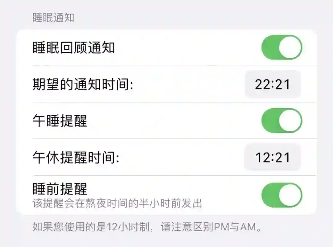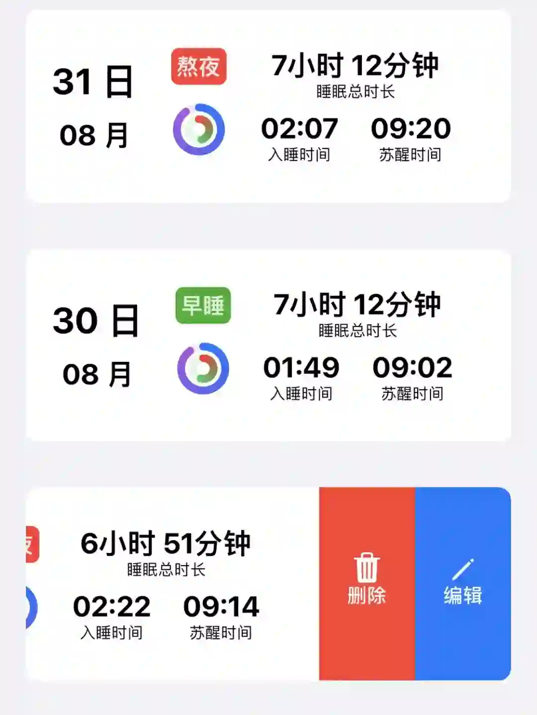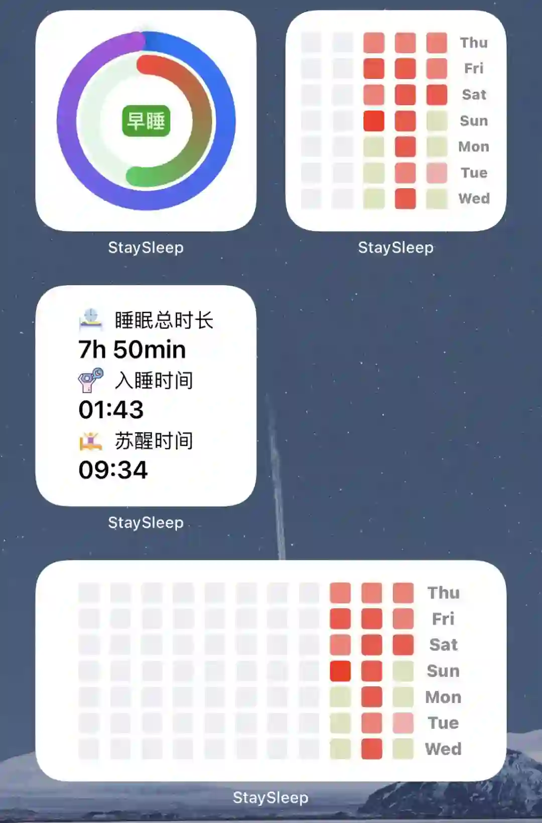 睡眠环形图:类 Apple 健身的环形图,分为内圈和外圈,用来查看您的熬夜情况和睡眠总时长是否达标,如果完全达标,两个圆环都会渐渐闭合。