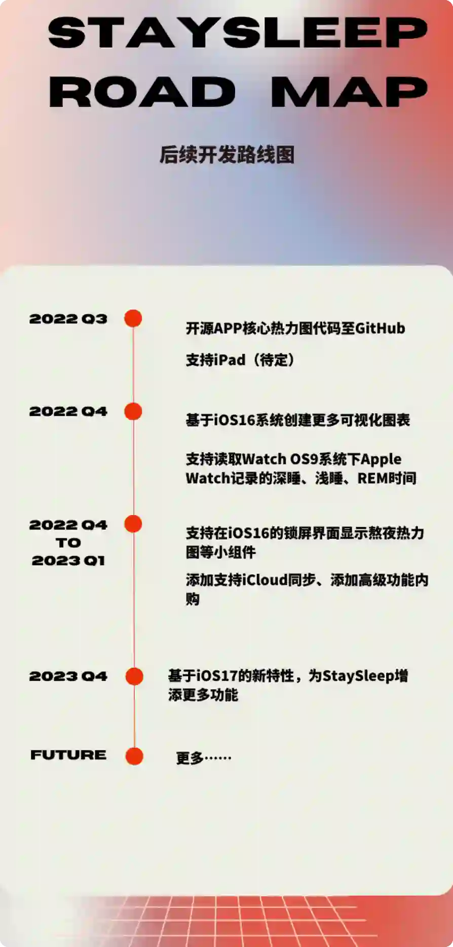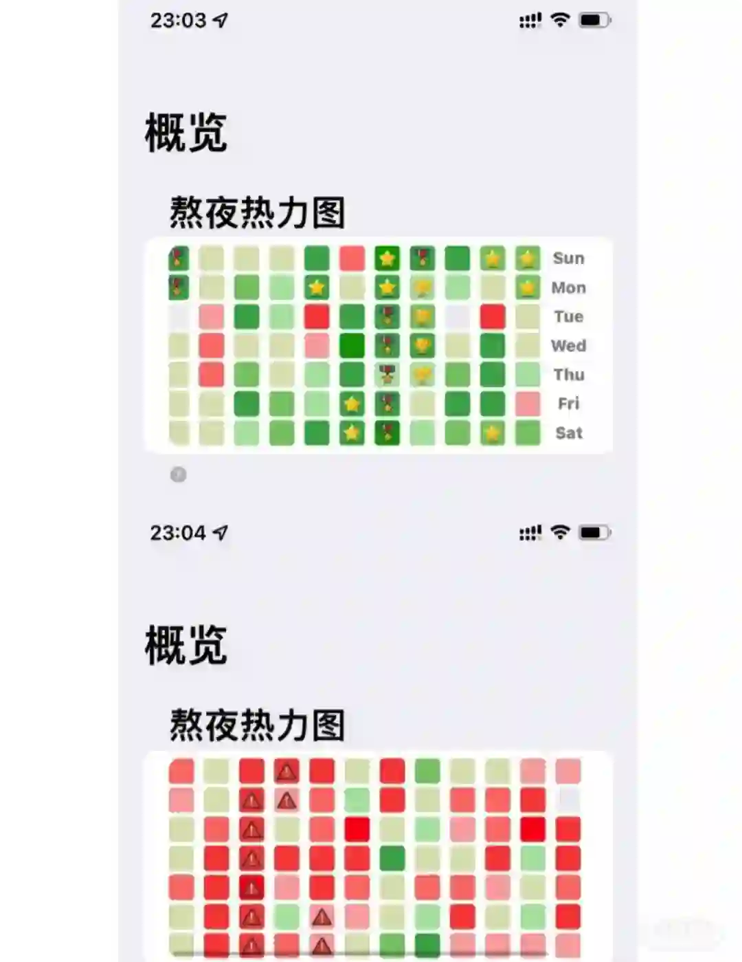 :我们将在最近几个版本更新热力图奖章,当连续四天不熬夜时,热力图上会出现「⭐️」星星标识,而连续十一天以上不熬夜,热力图上会出现金灿灿的「🏆」奖杯标识。而在未来,我们也会推出类似于 Apple 健身一样的奖章,并创建一个奖章墙,用于展示每月的早睡情况,通过奖章的方式激励大家减少熬夜的次数。