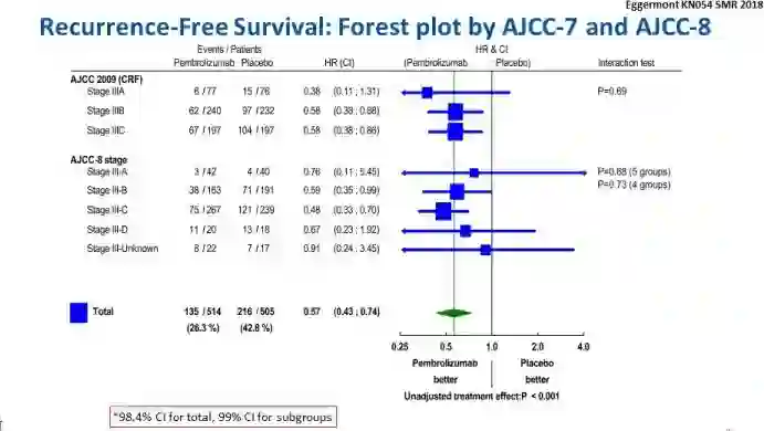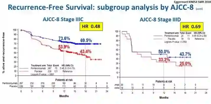 在今年的SMR(黑色素瘤研究者大会)上,学者应用了AJCC 8th的新分期系统,重新评估了KEYNOTE-054研究的结果,得到了一些有趣的提示,结果发现作为复发风险较低的IIIA人群,反而较IIIB和IIIC患者更能够从免疫治疗中获益。经过了AJCC 8th的重新分析后,IIIA-IIIC人群随着肿瘤负荷的不断加重,能够从免疫治疗中得到的益处更多。这说明新的分期系统能够更好地评价辅助治疗的效果。