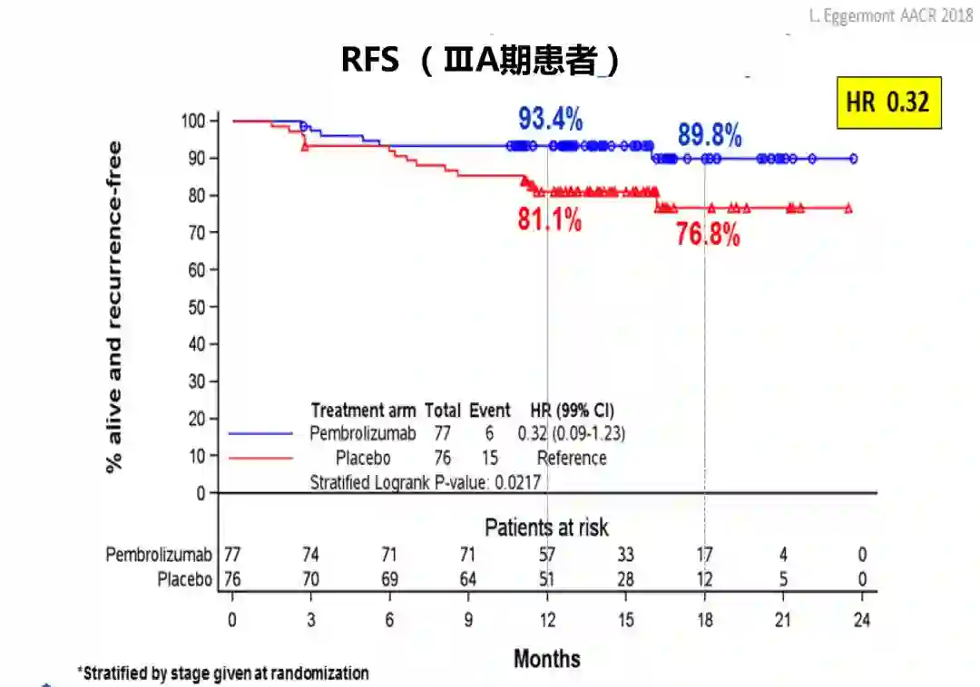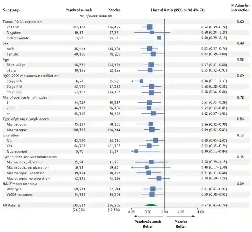 研究结果发现,帕博利珠单抗相对安慰剂显著延长了III期黑色素瘤的术后无复发生存(1年的RFS,75.4% vs 61.0%,HR 0.74,P<0.001)。任何分层分析中的亚组都更倾向于免疫治疗。其中,肿瘤内PD-L1表达阳性的患者从免疫治疗中获益更多(1年RFS,77.1% vs 62.6%,HR 0.54,P<0.001)。从分期分层来看,IIIA期的低危患者反而较IIIB和IIIC期,更能从免疫治疗中的获益。