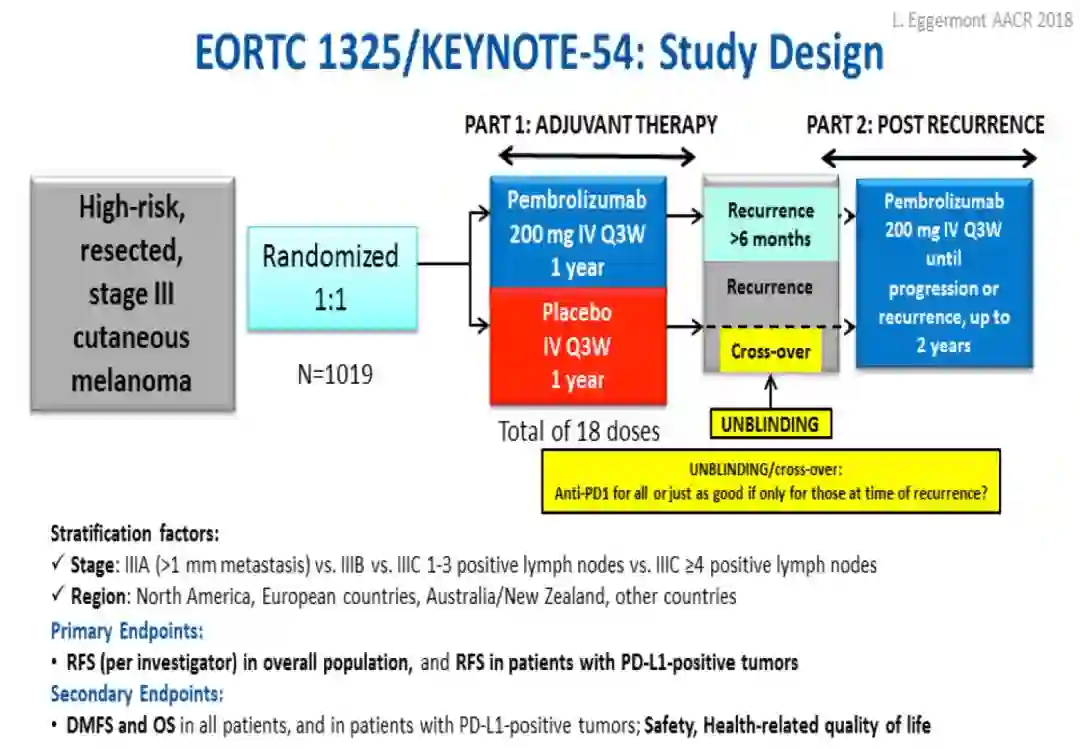 研究在北美、欧洲、澳洲等23个国家或地区的123家临床中心开展,纳入接受手术切除的III期黑色素瘤人群,随机分成两组,试验组接受帕博利珠单抗辅助治疗,方案为200mgQ3W,1年;对照组以相同的治疗频率给予安慰剂治疗。1年后停药随访直至出现复发。试验组若复发在免疫治疗结束6个月以上,可以再次接受免疫治疗,对照组复发的患者可交叉至免疫治疗。研究终点为无病生存率。