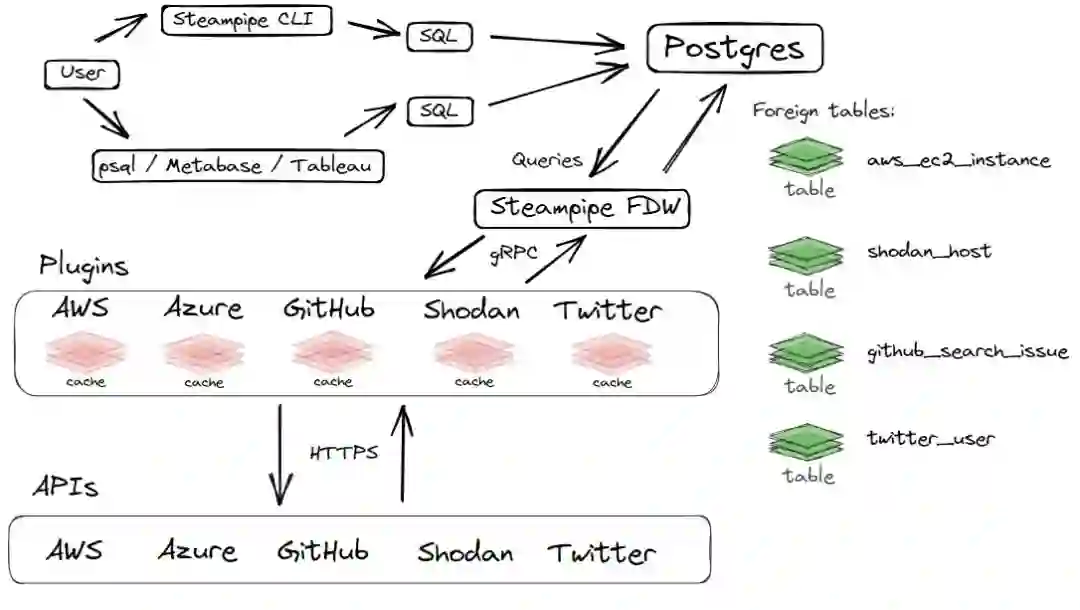 它可以用来完成简单的工作,但如果你需要跨多个 AWS 帐户和地区查询数据,事情就变得复杂了。这还不包括访问其他主流云平台(Azure、GCP、Oracle Cloud),更不用说 GitHub、Salesforce、Shodan、Slack 和 Zendesk 等服务了。开发人员花了太多的时间和精力从这些 API 获取数据,然后将其规范化并开始真正的分析任务。