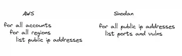 本文的案例研究将展示如何使用 Steampipe 来回答这个问题:我们的公共 EC2 实例是否有已被 Shodan 检测到的漏洞?我们需要使用 AWS API 列出 EC2 的公共 IP 地址,并使用 Shodan API 来检查它们。