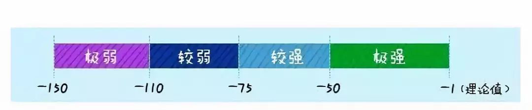 手机通用的信号强度的单位是 dBm(毫瓦分贝),dBm 是通过对数计算出来的,所以dBm一般都是负数。数值越大(考虑正负号),信号也就越好,比如 -40dBm 的信号比 -50dBm 的好。具体数值判断可以参考下图。