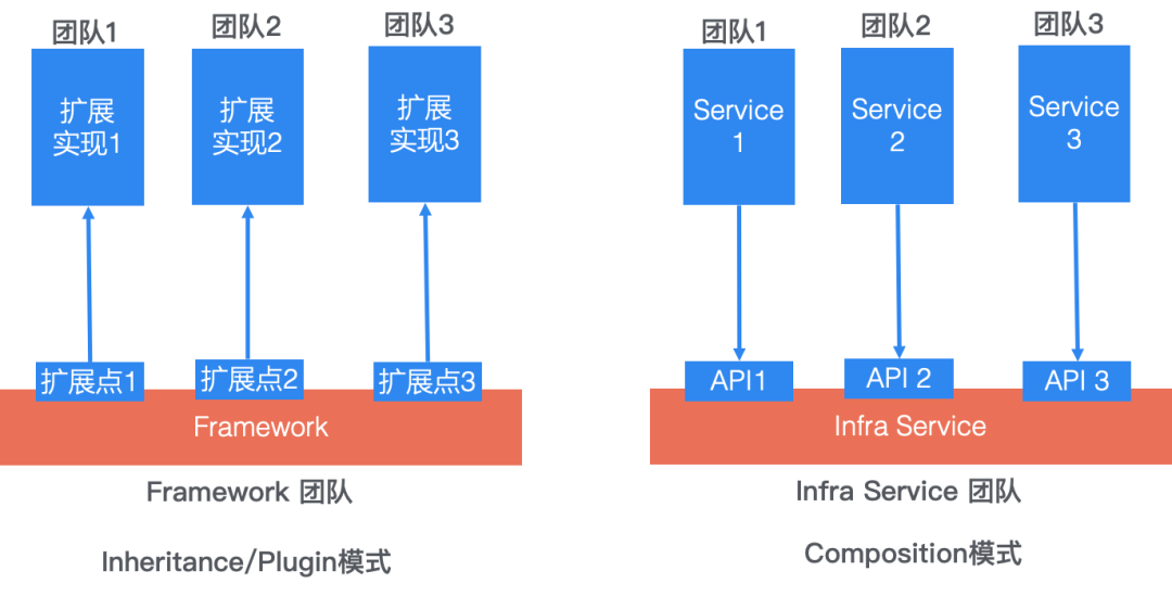 上图左侧是Inheritance(继承或者是扩展模式),有四个团队,其中一个是Framework团队负责框架实现,框架具有三个扩展点,这三个扩展点有三个不同的团队实现插件扩展,这些插件被Framework调用,从架构上,这是一种类似于继承的模式。