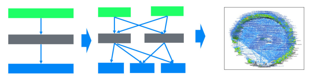 大型系统的本质问题是复杂性问题。互联网软件,是典型的大型系统,如下图所示,数百个甚至更多的微服务相互调用/依赖,组成一个组件数量大、行为复杂、时刻在变动(发布、配置变更)当中的动态的、复杂的系统。而且,软件工程师们常常自嘲,“when things work, nobody knows why”。
