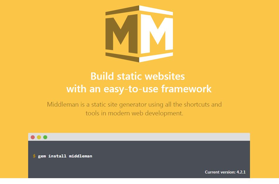 Middleman 是一个 Ruby 编写的静态网站生成器,他可以让你使用几乎所有在Ruby Web开发中所使用的技术和工具来构建各种类型的静态网站。比如:在 Ruby on Rails 经常用到的 Sass、CoffeeScript、Sprockets、Erb & Haml 等,都可以在 Middleman 里使用。