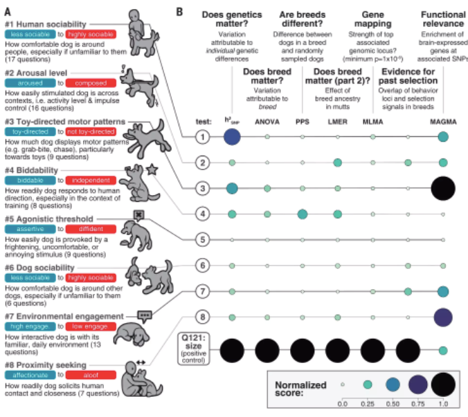 (1)驯良能力,即狗对人类指令的反应程度,研究通过对10253只狗关于8个问题的应答进行测试。(2)遗传性,研究对1910条狗的遗传序列进行调查发现,遗传性为30.5%。