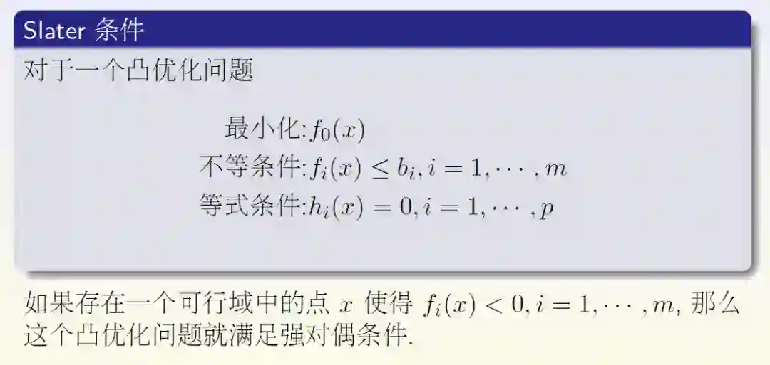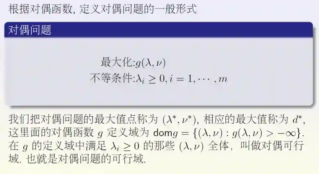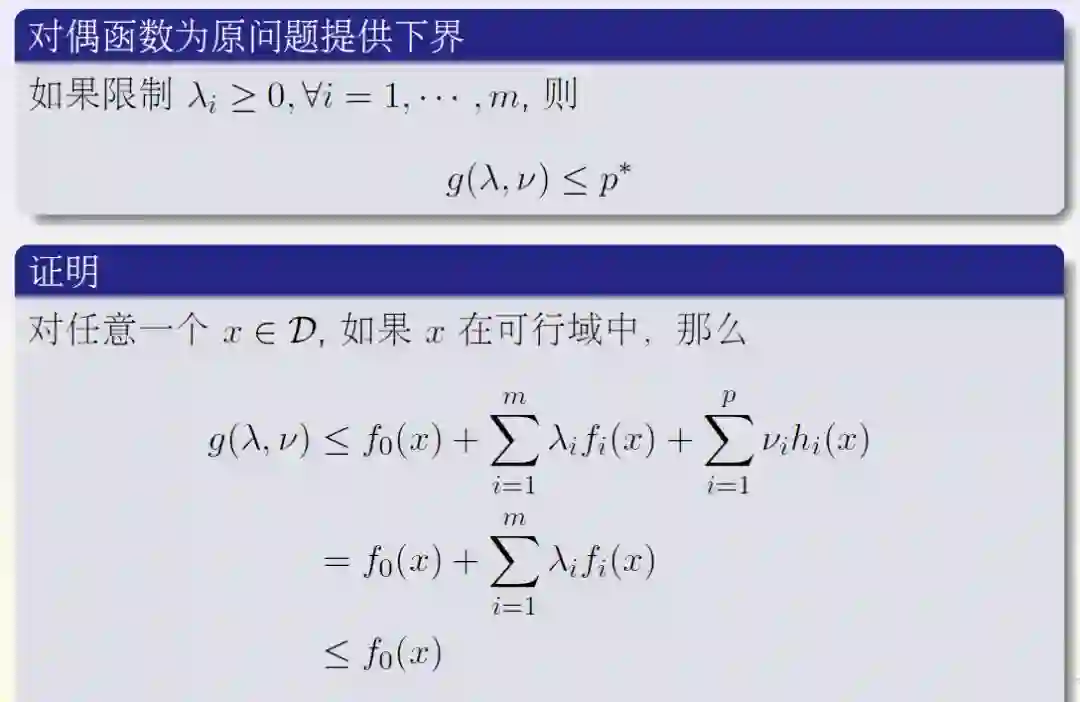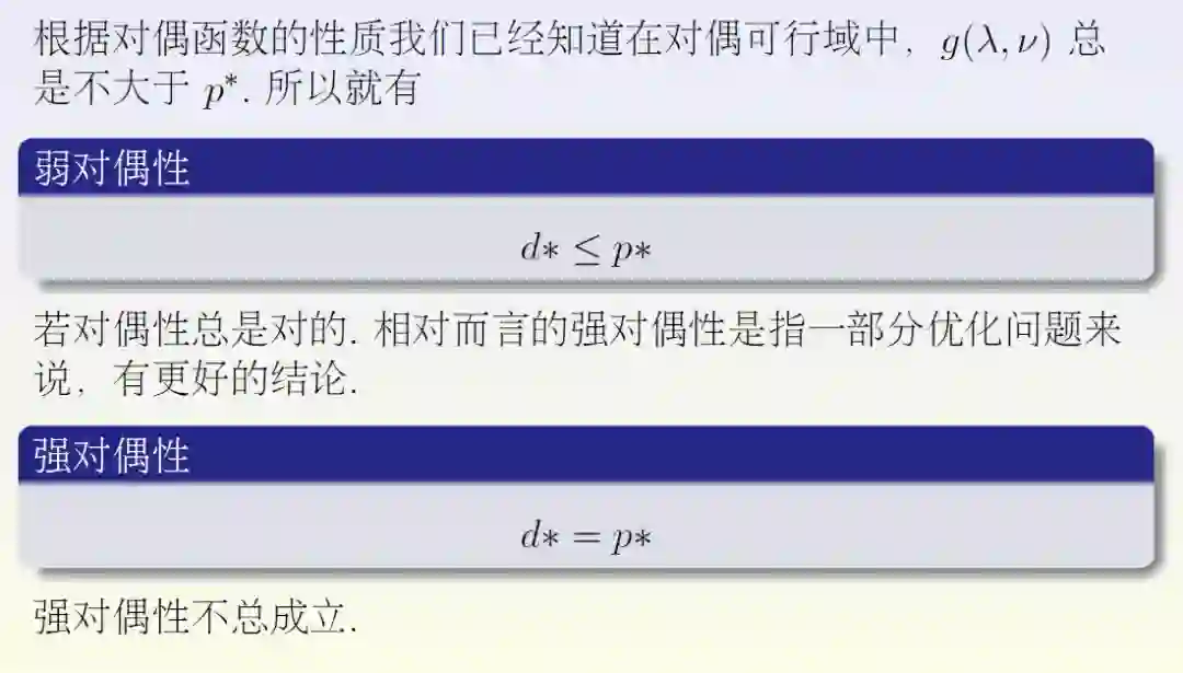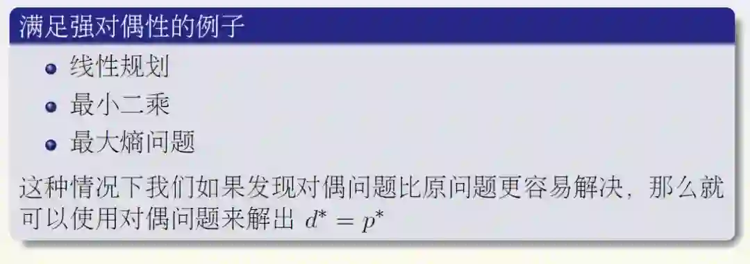 对偶方法的主要目的是处理原问题中的复杂边界条件;对偶问题永远是凸问题; 弱对偶性永远成立,可以为原问题提供下界。