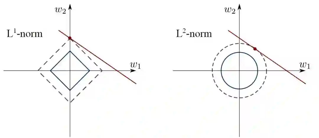 右图:𝑥12+𝑥22的等高线是圆,此处最优解中𝑤1,𝑤2≠0,不具备稀疏性。