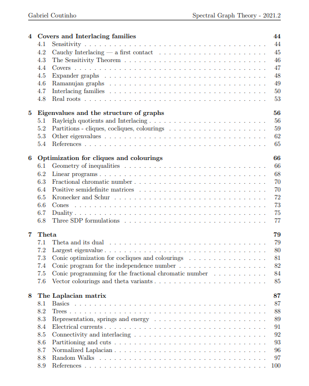 10谱图理论就是研究如何通过几个容易计算的定量来描述图的性质。通常的方法是将图编码为一个矩阵然后计算矩阵的特征值。来自Gabriel Coutinho的最新谱图理论笔记。