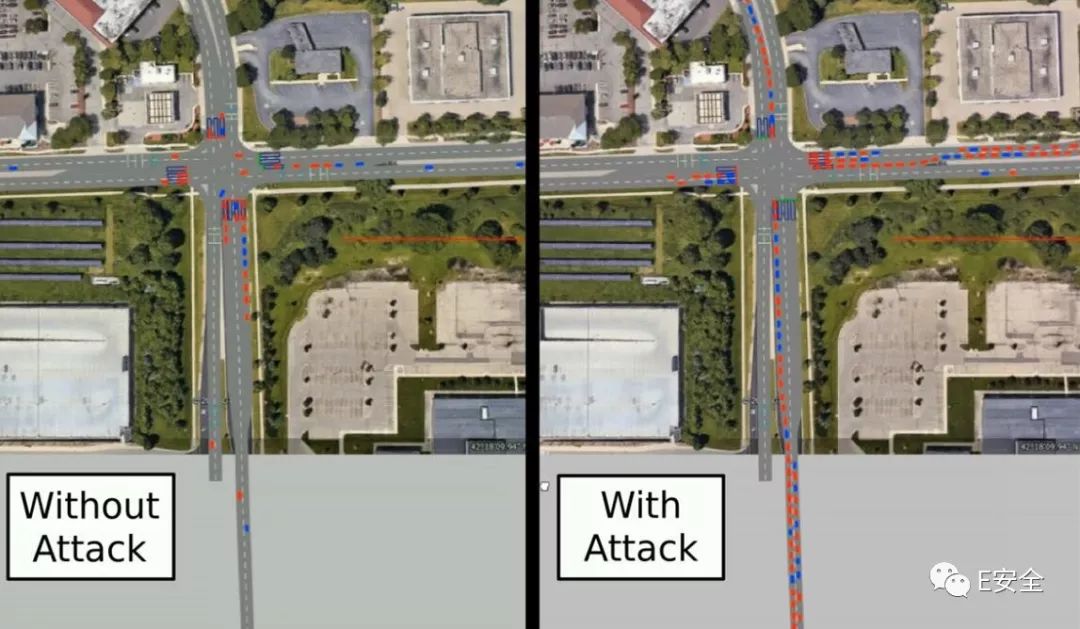 来自单一恶意车辆的欺骗性先进数据将能够将路口车流的总延迟时间提升高达68.1%,这将完全破坏 I-SIG 系统所带来的车流疏导优势(该系统被认为能将延迟时间降低26.6%),使用 I-SIG 系统竟然比不使用 I-SIG 系统还要拥堵,当前路段的流通能力比不使用 I-SIG 系统的情况低23.4%。