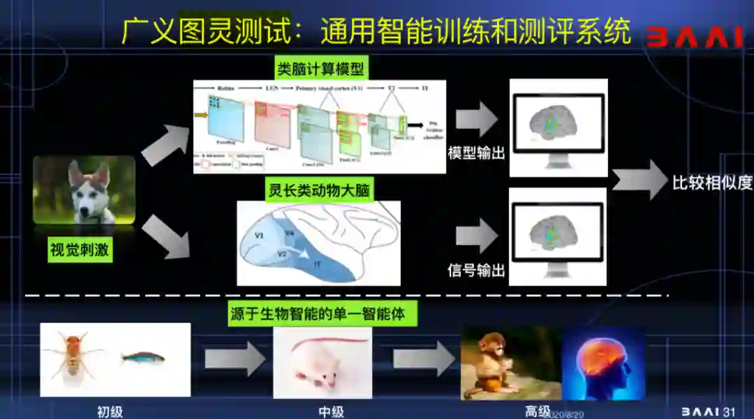 黄铁军表示,为了探究强人工智能的可能,智源研究院将相继研发神机 1 号(高精度精细神经网络仿真系统)、神机2号(大规模脉冲神经网络系统)和神机3号(高精度大规模通用智能模拟系统)等仿真平台;此外,针对强人工智能的发展,智源研究院将开放并提供一个通用智能训练和测评系统——「广义图灵测试」。