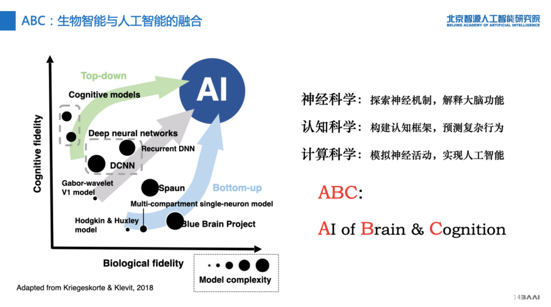 会上,智源首席科学家刘嘉作了题为「ABC:AI of Brain & Cognition」的主题报告。刘嘉提到最近比较火热的生成式语言模型GPT-3通过对大量书面材料集与长篇连载文本的预训练,获取关于世界的知识,将「暴力美学」发挥到极致,然而却无法做到理解、共情、推理等对于人类极为容易的事情。「认知神经基础」重大研究方向则希望能够探索生物智能,将生物智能与人工智能进行融合。为此,刘嘉表示整个「认知神经基础」课题团队,将致力于将神经科学、认知科学和计算科学进行交叉融合,从三个方向向通用人工智能靠近。