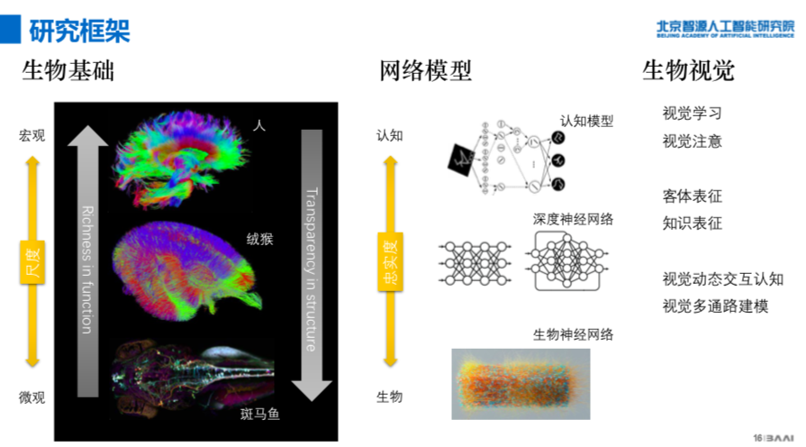 刘嘉表示,从认知神经的角度考虑,理解智能有三个层级,硬件层面、表示与算法层面以及计算理论层面;对应到生物智能中,分别是脑神经结构、生物神经网络模型以及认知模型。课题组将分别从三个层面进行研究:生物基础、网络模型、生物视觉。