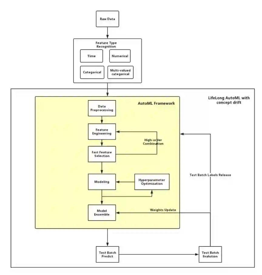 本届 AutoML 比赛和之前 AutoML 比赛最大的区别主要存在两个方面:一是输入数据集的特征具有较强的多样性,而且需要选手自行处理输入数据集的特征;二是需要处理 Lifelong mechine learning 场景下的概念漂移(concept drift)问题。首先,在特征工程方面,PASA 团队运用了自动化特征编码、自动化特征组合以及自动化特征选择等方法实现特征的设计和提取。其次,在处理概念漂移方面 PASA 团队通过设计在线增量学习框架捕获长期的 concept 和短期的 concept,并采用基于时间窗口的自适应模型加权集成学习算法提升预测性能,集成学习的基学习器可采用梯度提升树模型。