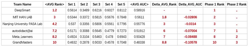 上图分别展示了 Feed-Back 阶段及 Blind-Test 阶段的排行榜。值得注意的是,在 Feed-Back 阶段的 Top6 队伍中有 5 支队伍并未进入 Blind-Test 阶段的排行榜。本次 AutoML 竞赛在时间及内存上有很大的限制,其中两个阶段在内存上都限制为 16G,Feed-Back 阶段 5 个任务限制总时间为 7800 秒,Blind-Test 阶段 5 个任务限制总时间在 10400 秒以上。比赛说明中明确 Blind-Test 与 Feed-Back 的数据是可比的,在 Feed-Back 阶段中 Top 队伍都能在限制的时间和内存内完成 5 项任务的建模,然而在 Blind-Test 中 Feed-Back 阶段具有领先优势的 Top 队伍在 Blind-Test 中因在某个数据或者特征量相对较大的任务上没能在限制的内存之内完成 AutoML 的整个建模流程,因此在 Blind-Test 中无得分,尽管 Feed-Back 阶段 Top 队伍做了许多优秀的工作,但最后 Top 队伍还是无缘 Blind-Test 榜单。