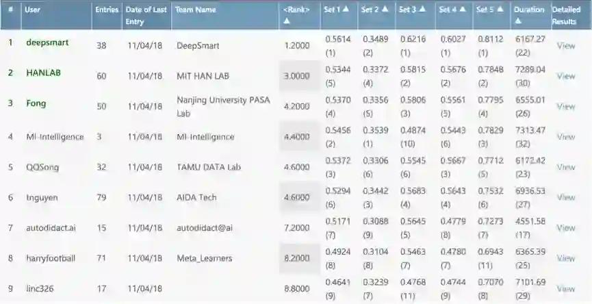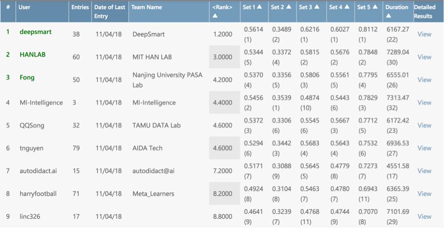近期,NeurIPS 2018 AutoML 挑战赛公布了最终结果。本次竞赛由第四范式、ChaLearn、微软和阿卡迪亚大学联合举办,专注于终生机器学习领域。竞赛总共分为两个阶段,Feed-Back 阶段及 Blind-Test 阶段,在 Feed-Back 阶段,微软与北京大学组成的 DeepSmart 团队斩获第一名,MIT 和清华大学组成的 HANLAB 斩获第二名,南京大学 PASA 实验室斩获第三名。Blind-Test 阶段由 Autodidact.ai、Meta_Learners、GrandMasters 斩获前三名。