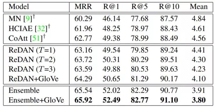 本文使用的数据集是 visual dialog V1.0 (https://visualdialog.org/),评价指标是 NDGC (Normalized Discounted Cumulative Gain),相关实验结果如下: