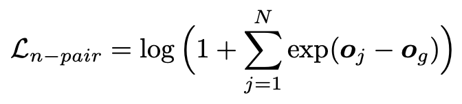 在训练时,本文考虑了两种损失函数,交叉熵和 n-pair 损失,交叉熵好理解,将 o 送个一个分类层,n-pair 损失的计算方式如下:假设第 g 个是正确答案,则损失定义为:
