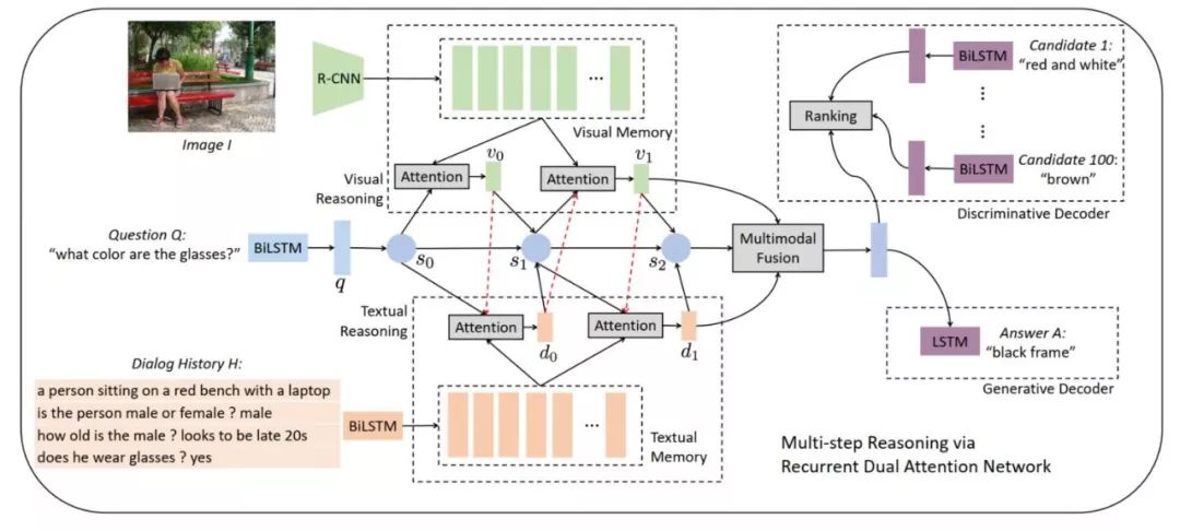 模型框架图加个外框感觉就好看很多,可以学习学习。从框架中可以看出模型主要包含三个模块:1)memory generation:生成一套文本和图像的 memory,用于下一步的 reasoning;2)Multi-step Reasoning:使用循环双重注意力去联合编码问题,图像和对话历史,用于接下来的解码;3)Answer Decoding:使用上一步得到的联合编码向量去推断答案。