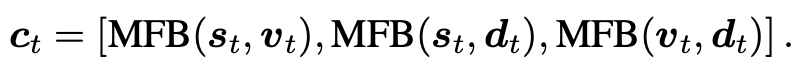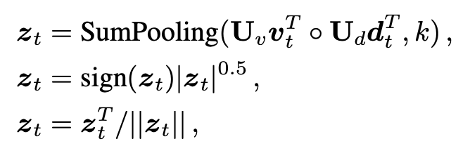 在之前的两步,是为了获取更多的有用的信息,因此使用注意力机制不断更新需要关注的地方,而这一步应该是将这些选择出来的信息进行融合,为回答问题提供辅助,也即这一步需要的是通过融合,得到送给 RNN 的输入,通过 RNN 的隐层状态更新,从而得到问题的新的表示。因此这里使用了 MFB 的方式来进行更新。