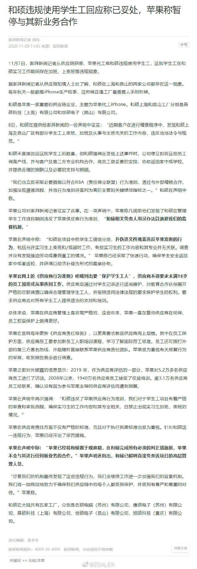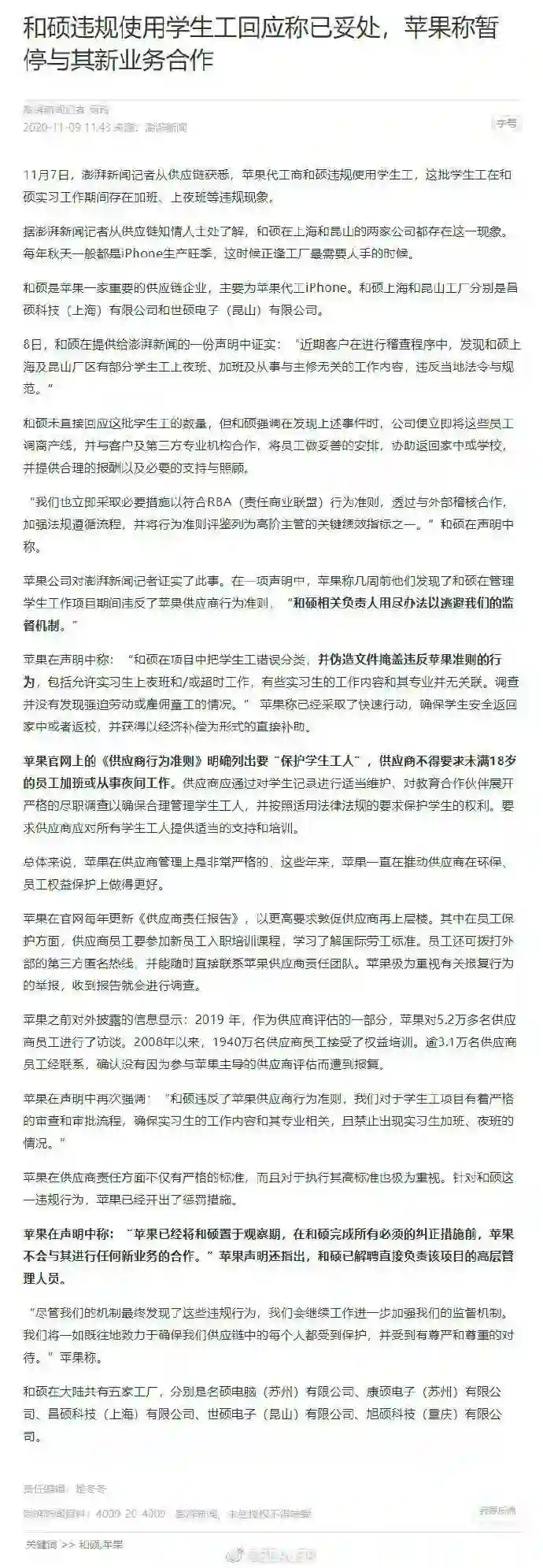 11 月 7 日,澎湃新闻报道,苹果 代工商和硕违规使用学生工,这批学生工在和硕实习工作期间存在加班、上夜班等违规现象。苹果称已经采取了快速行动,确保学生安全返回家中或者返校,并获得以经济补偿为形式的直接补助。