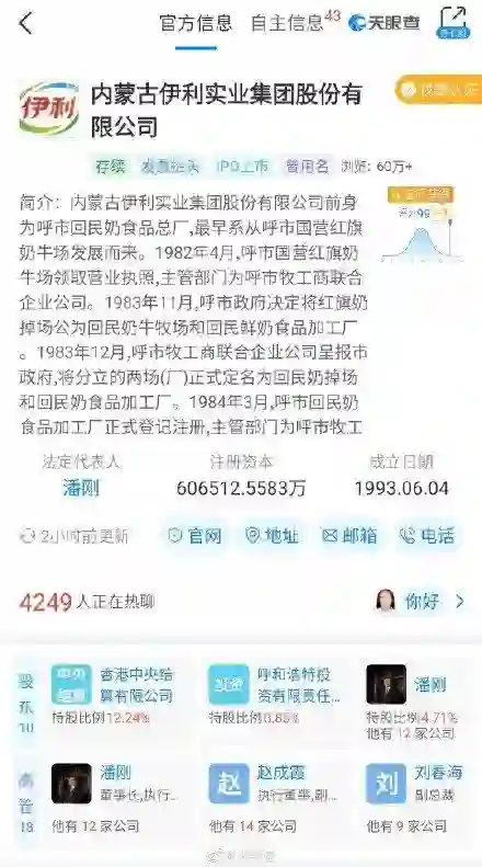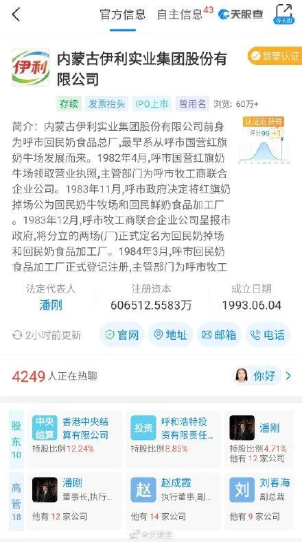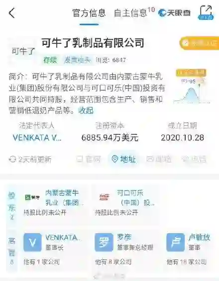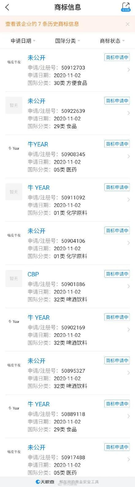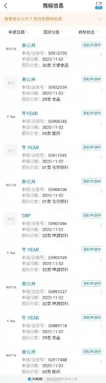 天眼查 App 显示,近日,内蒙古伊利实业集团股份有限公司申请多条“牛 YEAR ”、“嗨皮牛夜”商标。国际分类涉及方便食品、食品、医药、啤酒饮料等,状态为商标申请中。此前,蒙牛和可口可乐共同出资成立了新公司,公司名称为“可牛了乳制品有限公司”。