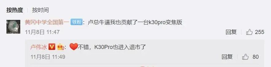 小米集团中国区总裁、Redmi 品牌总经理卢伟冰昨日在与米粉互动时透露,K30 Pro进入退市。