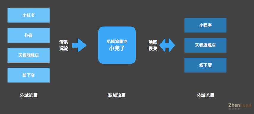 公域流量中小红书、抖音、天猫旗舰店、线下店等通过沉淀好友关系、微信群关系,进一步裂变到其他的公域。