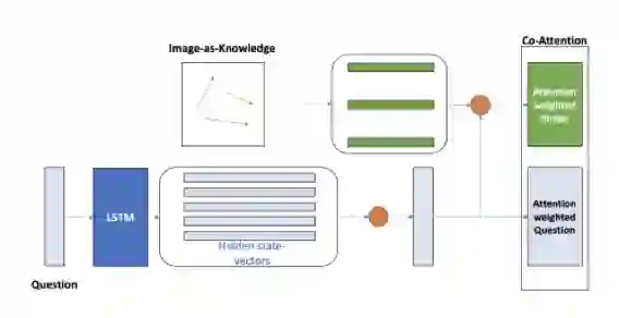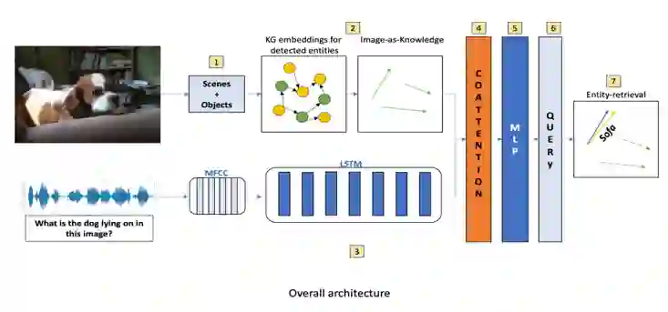 论文的方法的整体过程如图所示,首先问题和场景检测器是被图像中的实体构成,然后图像被表示为检测到的实体的KG embedding特征集合,语音问题的MFCC特征由LSTM编码并传递到co-attention层,与图像编码进行融合,经过一个全连接层后,到达查询层,最后与查询最接近的实体被获取作为问题的答案