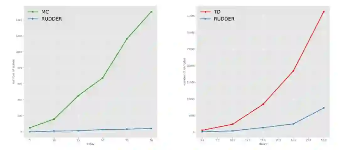 摘要:我们提出了一种针对延迟奖励的有限马尔可夫决策过程(MDP)的新型强化学习方法。本研究证明了时间差分(TD)估计偏差的纠正速度仅在延迟步上出现指数级的减慢。此外,本研究还证明蒙特卡洛估计方差可以增加其他估计值的方差,使之在延迟步上出现指数级的增长。我们介绍了一种返回值分解方法(return decomposition method)RUDDER,该方法使用和原始 MDP 一样的最佳策略创建了一个新的 MDP,但是其再分配奖励的延迟已经大大降低。如果返回值分解方法是最佳策略,那么新的 MDP 不会有延迟奖励,TD 估计也不会出现偏差。在这种情况下,奖励追踪 Q 值,这样未来的期望奖励值就保持为零。我们通过实验确认了关于 TD 估计偏差和 MC 估计方差的理论结果。在不同长度的奖励延迟的任务中,我们展示了 RUDDER 的速度是 TD、MC 以及 MC 树搜索(MCTS)的指数级。在延迟奖励 Atari 游戏 Venture 中,RUDDER 仅学习了一小段时间,其性能就优于 rainbow、A3C、DDQN、Distributional DQN、Dueling DDQN、Noisy DQN 和 Prioritized DDQN。RUDDER 在更少的学习时间内显著提高了在延迟奖励 Atari 游戏 Bowling 上的当前最优性能。