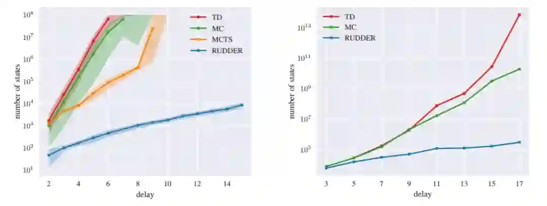 图 2:不同方法在不同延迟下学习达到 90% 返回奖励的最佳策略的观察状态数(对数坐标)。我们对比了由 Q 学习实现的时序差分(TD)、蒙特卡洛(MC)、蒙特卡洛树搜索(MCTS)和 RUDDER。左:Grid World 环境。右:Charge-Discharge 环境。RUDDER 和其他方法所需状态的差距随着延迟步数的增加呈现指数级增长。