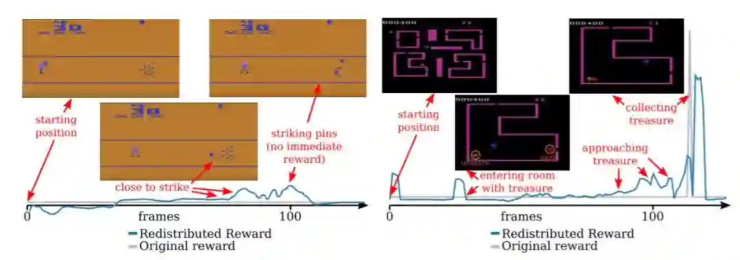 由于敏感度分析极大地阻碍了学习,我们对反向分析使用了贡献分析,例如贡献传播 [60]、贡献方法 [81]、excitation 反向传播 [127]、层级相关度传播(LRP)[3]、泰勒分解 [3,73] 或集成梯度(IG)[103]。使用贡献分析,预测的返回值可以沿着状态-动作序列分解为贡献。通过用实际返回值替代预测,我们得到了一个再分配奖励,进而获得一个新的 MDP,其最优策略和原始 MDP 相同。再分配奖励和奖励塑造(reward shaping)[76,122] 是很不同的,其将奖励变为状态的函数而不是动作的函数。奖励塑造和「回溯建议」(look-back advice)[123] 都保持了原始奖励,即仍然可能存在较长的延迟,从而导致学习过程指数级变慢。我们提出了 RUDDER,其通过返回值分解来执行奖励重分配,从而克服 TD 和 MC 因为延迟奖励而遇到的问题。RUDDER 可以极大地减少 MC 的方差,并极大程度地避免 TD 的指数级缓慢的偏差修正(对于最优的返回值分解,TD 甚至是无偏差的)。