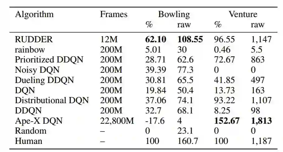 表 1:RUDDER 和其他方法在学习 Atari 游戏 Bowling 和 Venture 时的结果。在无操作指令开始条件下,各个方法在超过 200 个测试游戏中的归一化人类得分和原始得分:A3C 得分未报道,因为其在无操作指令开始条件下无法获得。其他方法的得分来自于之前的研究 [8, 39]。我们选择了仅基于 12M 帧训练损失的 RUDDER 模型。