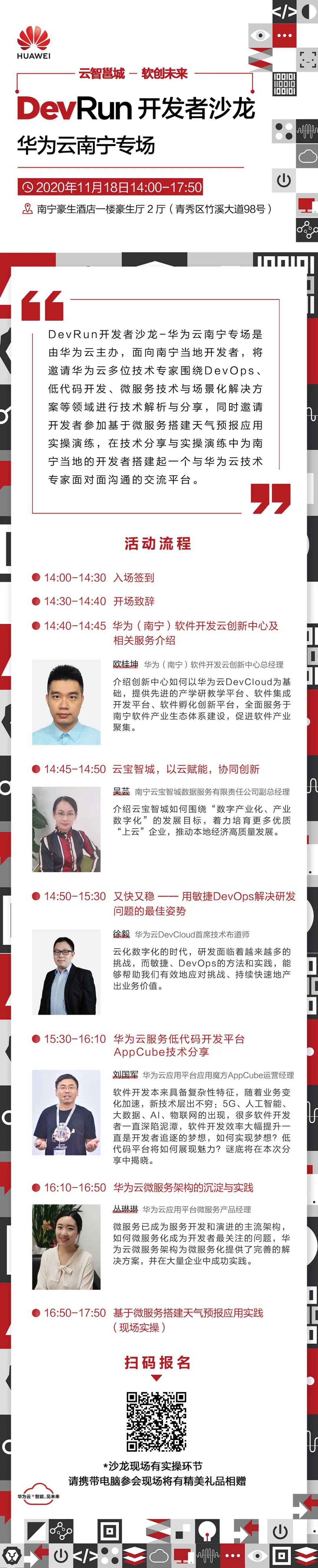 一座城市的发展离不开人才的集聚,站在技术风口上的开发者群体是推动创新变革的重要力量。11月18日,DevRun开发者沙龙将走进南宁,多位华为云技术专家将聚焦