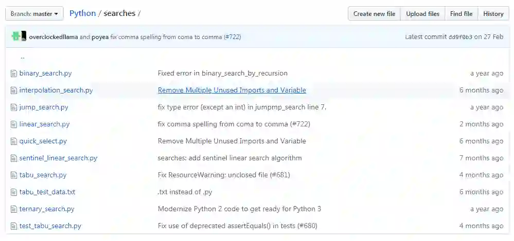 针对于查找问题,作者在 searches 文件夹中给出了包括顺序查找、二分查找、禁忌搜索等常见查找算法的实现。