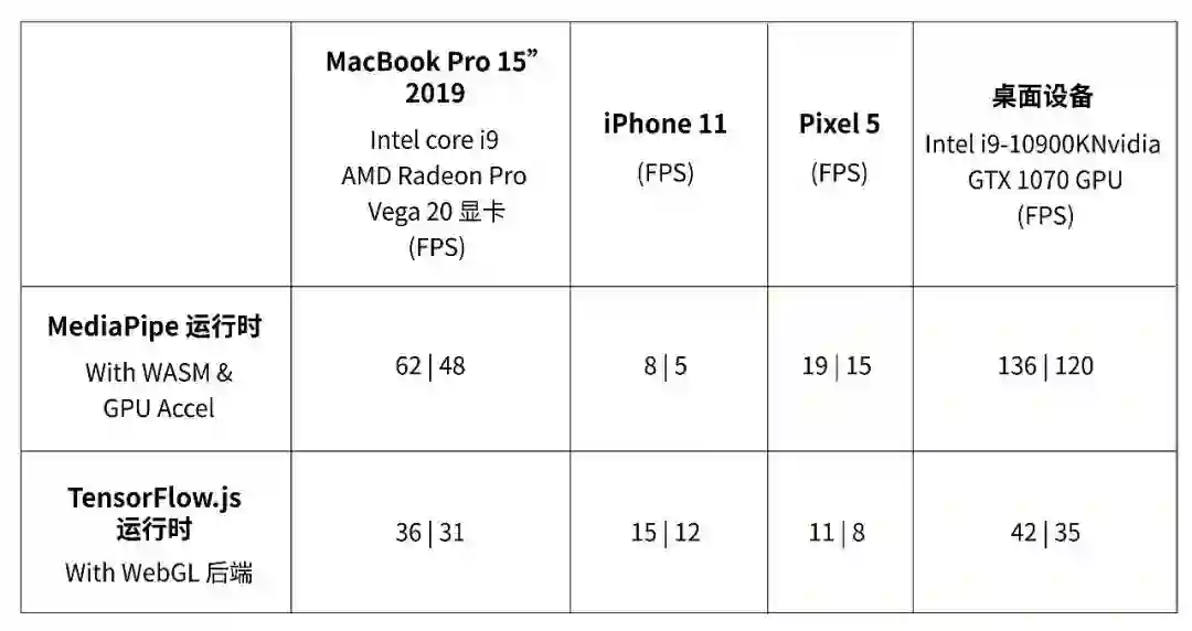 HandPose 在不同设备和运行时条件下的推理速度。每个单元中的第一个数字是精简模型,第二个数字是完整模型