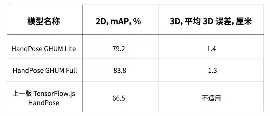 新发布的 HandPose GHUM 模型与之前发布的 TensorFlow.js HandPose 模型在 2D 和 3D 预测方面的质量指标