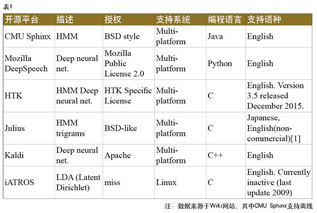 目前主流的开源平台包括CMU Sphinx、HTK、Kaldi、Julius、iATROS、CNTK、TensorFlow等,CMU Sphinx是离线的语音识别工具,支持DSP等低功耗的离线应用场景。由于深度学习对于语音识别WER的下降具有明显的作用,所以Kaldi、CNTK、TensorFlow等支持深度学习的工具目前比较流行,Kaldi的优势就是集成了很多语音识别的工具,包括解码搜索等。具体的开源平台汇总如表1所示。
