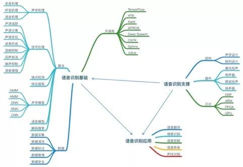 语音识别的知识体系可以划分为三个大的部分:专业基础、支撑技能和应用技能。语音识别的专业基础又包括了算法基础、数据知识和开源平台,其中算法基础是语音识别系统的核心知识,包括了声学机理、信号处理、声学模型、语言模型和解码搜索等。