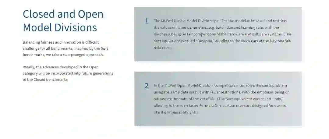另外,MLPerf还提出了一个Closed and Open Model Divisions的概念。Closed Model Division使用确定的模型和参数,以保证测试的公平性。而Open Model Division则会放宽一些限制,让大家可以有一定的发挥空间,鼓励软硬件的创新。