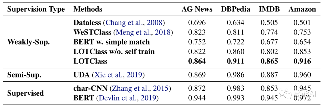 为了验证LOTClass的效果,论文在4个分类数据集上与监督、半监督和弱监督进行了对比。