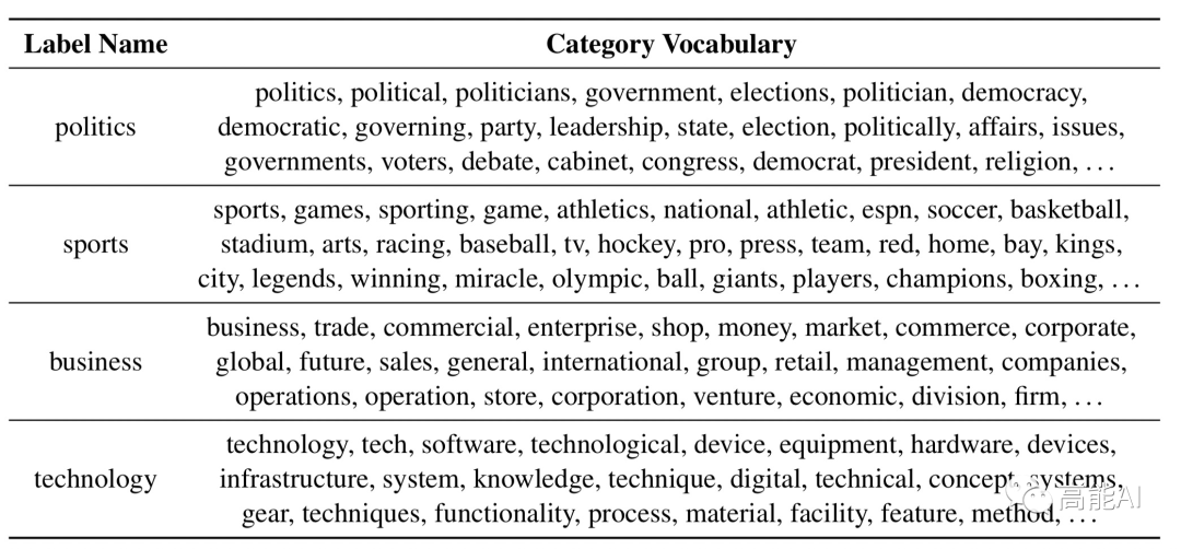 通过上述方式找出了AG新闻语料每一个类别-标签名称对应的类别词汇表,如上图所示。