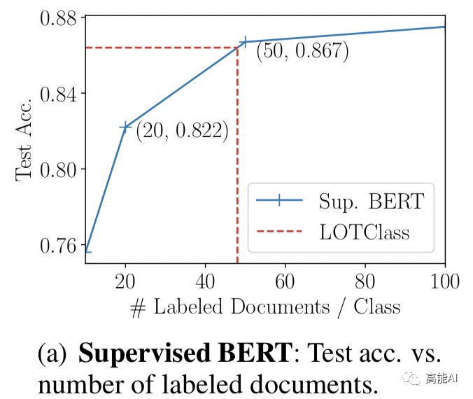 如上图,论文给出了答案,那就是:LOTClass效果相当于 每个类别使用48个标注文档的有监督BERT模型!
